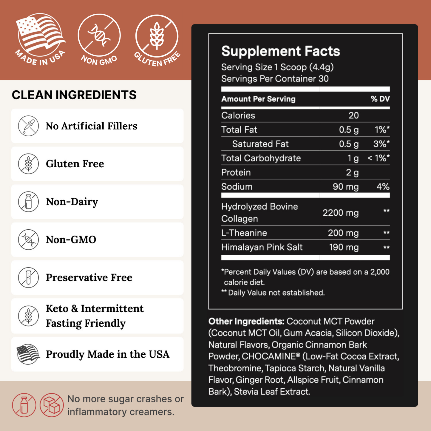 Coconut MCT Powder (Coconut MCT Oil, Gum Acacia, Silicon Dioxide), Natural Flavors, Organic Cinnamon Bark Powder, Low-Fat Cocoa Extract, Theobromine, Tapioca Starch, Natural Vanilla Flavor, Ginger Root, Allspice Fruit, Cinnamon Bark, Stevia Leaf Extract.