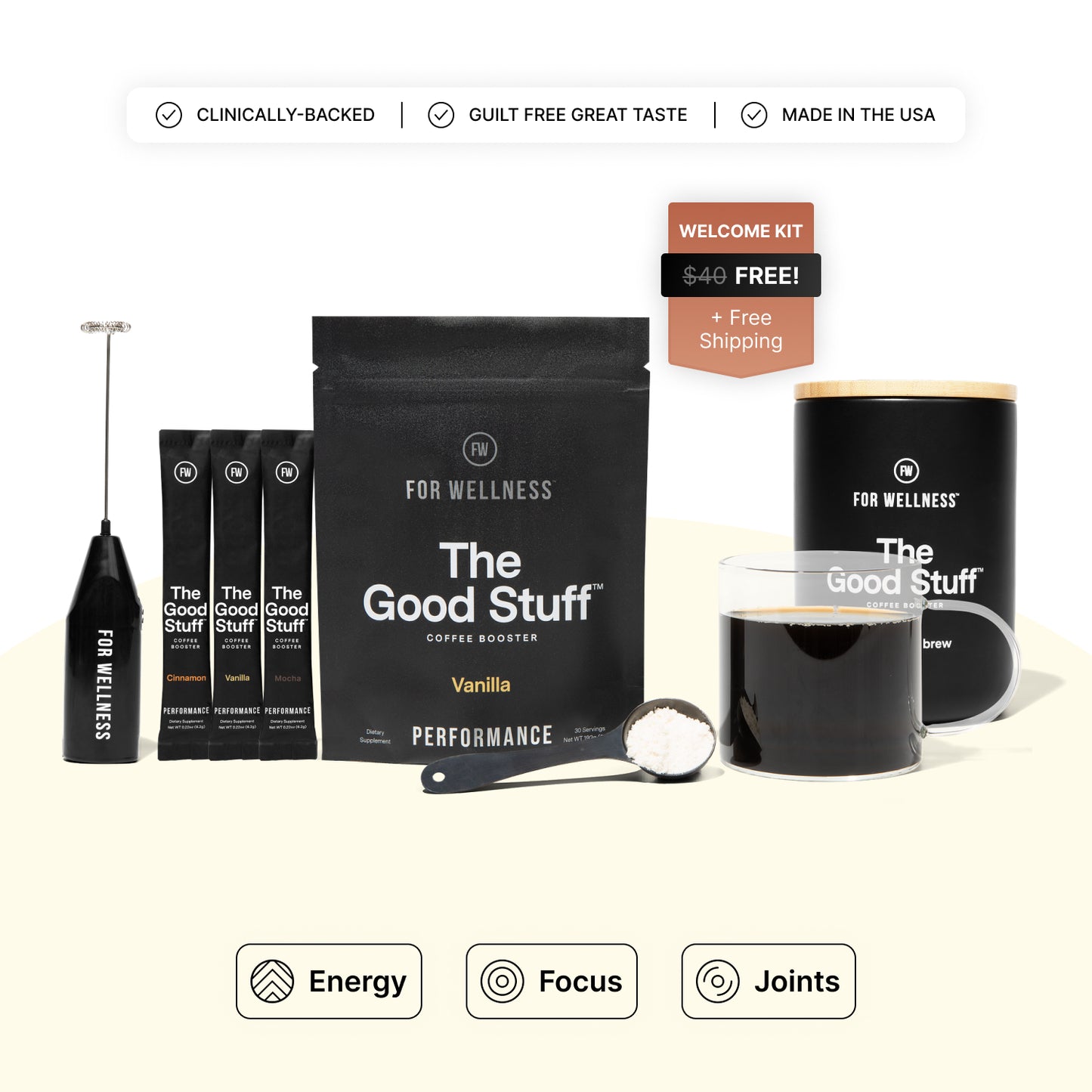 Don't change your coffee, just add The Good Stuff. One scoop of our science-backed formula makes any coffee taste incredible and boost your physical and mental health.